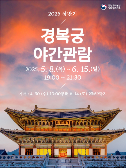 2025년 경복궁 야간관람은 5월 8일(목)부터 6월 15일(일)까지 진행됩니다. 예매는 4월 30일(수) 오전 10시부터 시작됩니다.